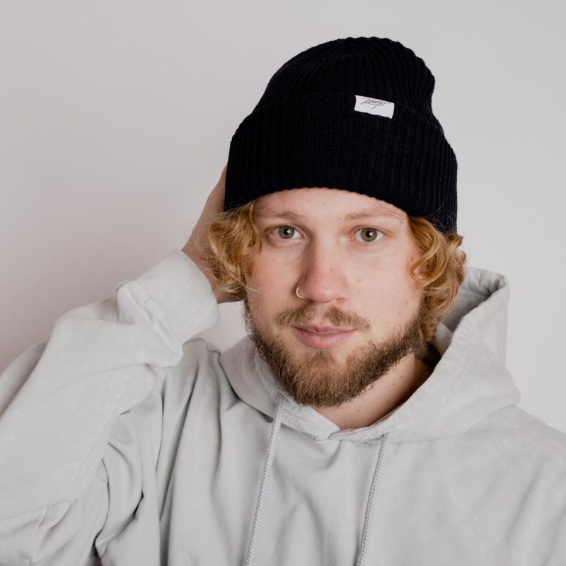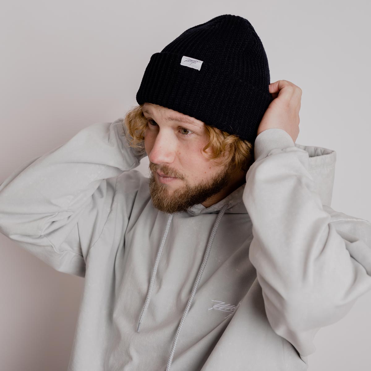 Dicke Grobstrick-Beanie in schwarz mit kleinem Mojo-Aufnäher
