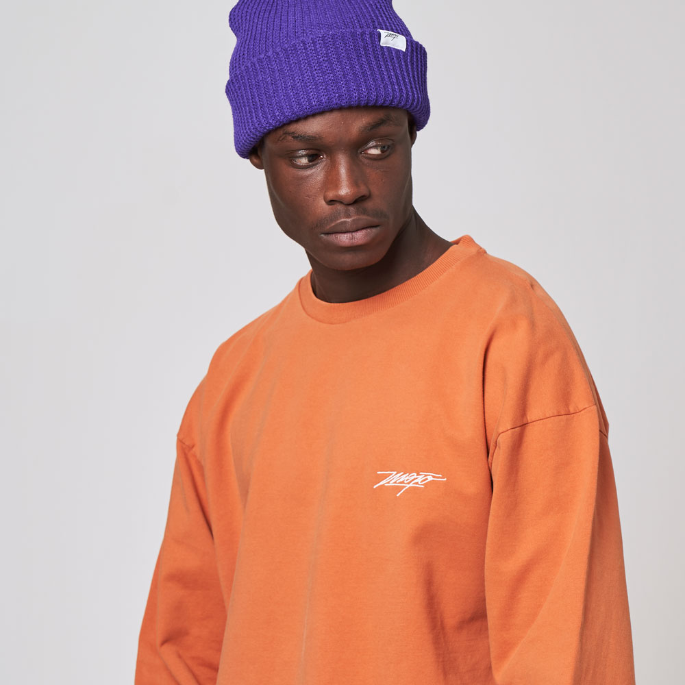 Dicke Grobstrick-Beanie in lila mit kleinem Mojo-Aufnäher