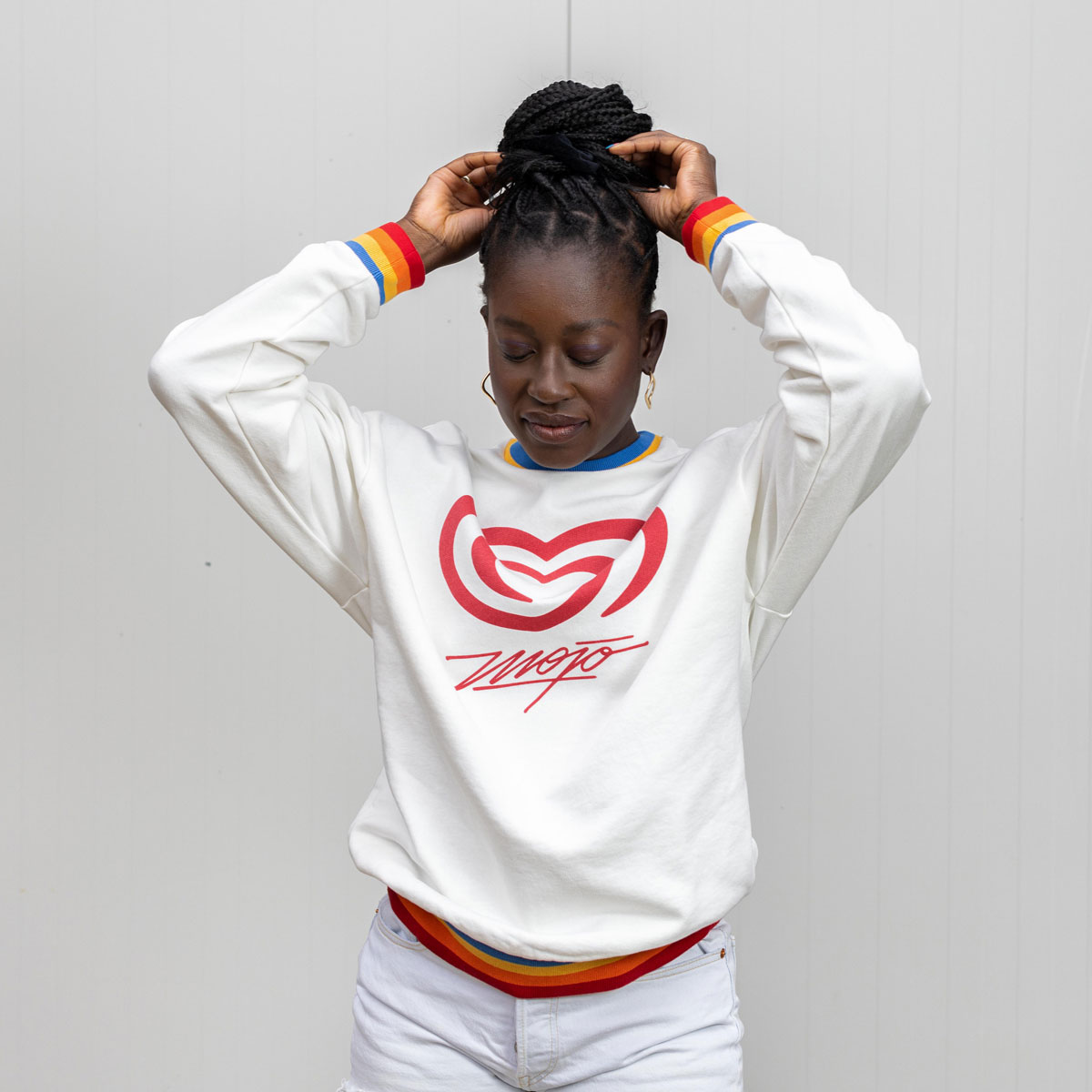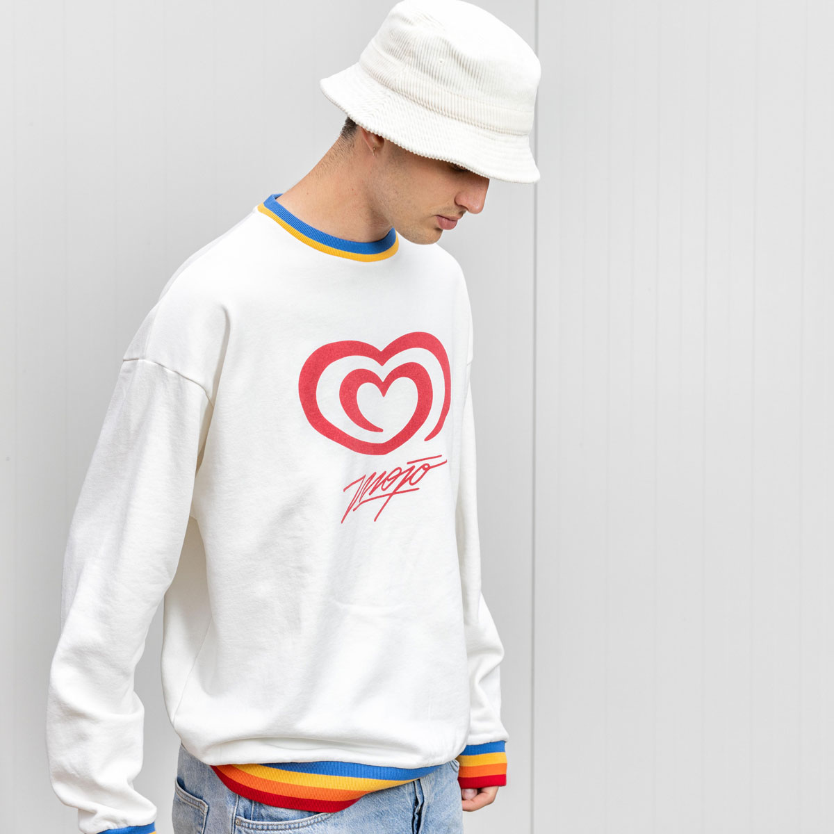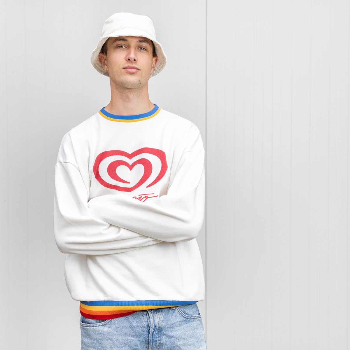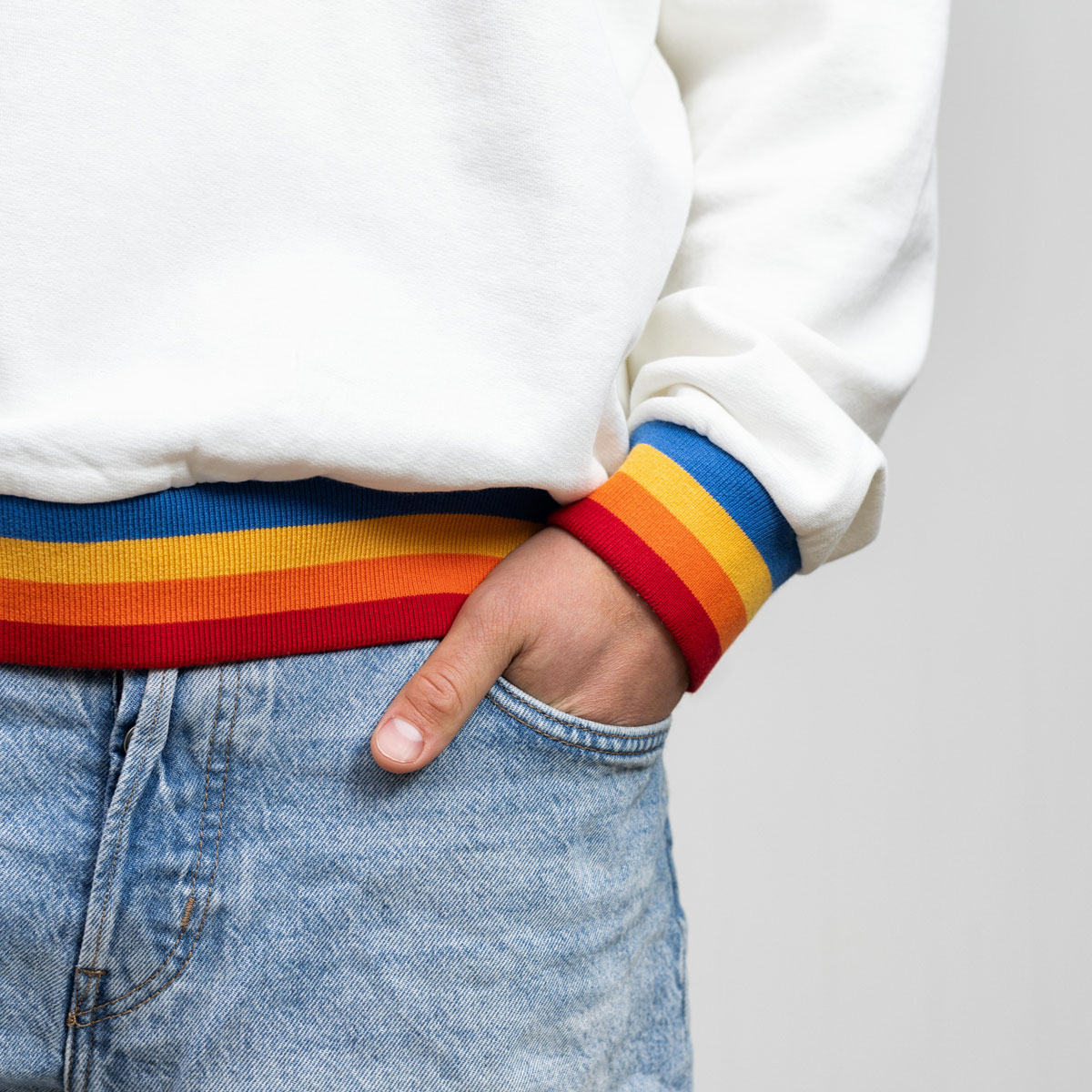 Der Fit vom Crew ist regular mit Dropped-Shoulder, der Stoff ultraweich // Special sind natürlich die Bündchen in Rainbow-Colors.
