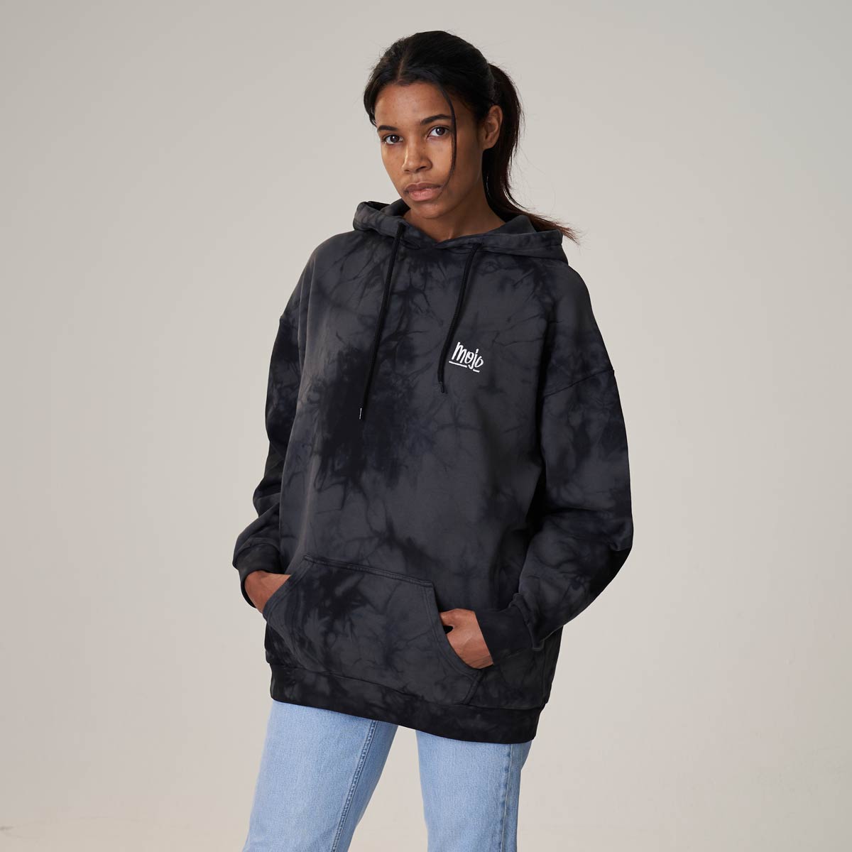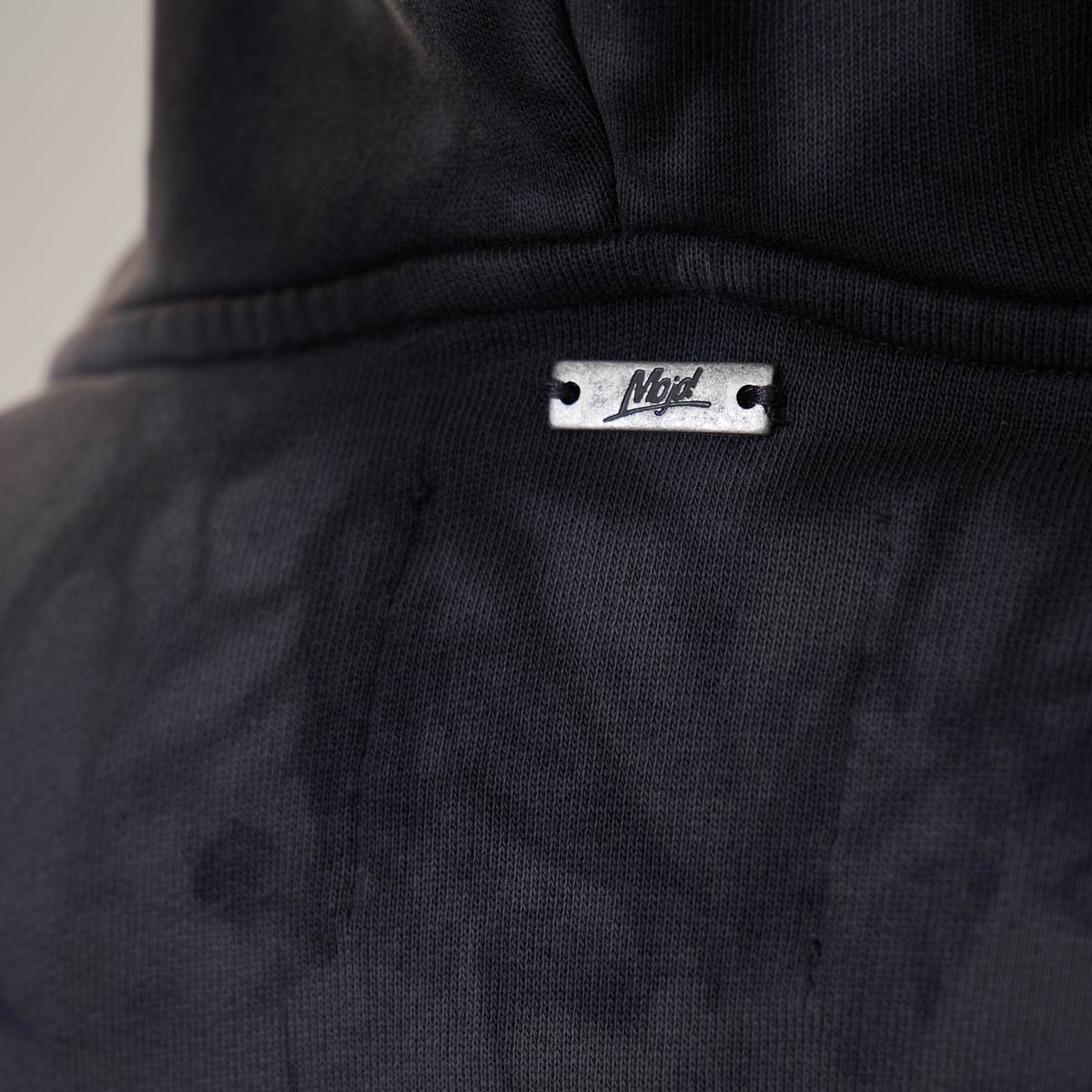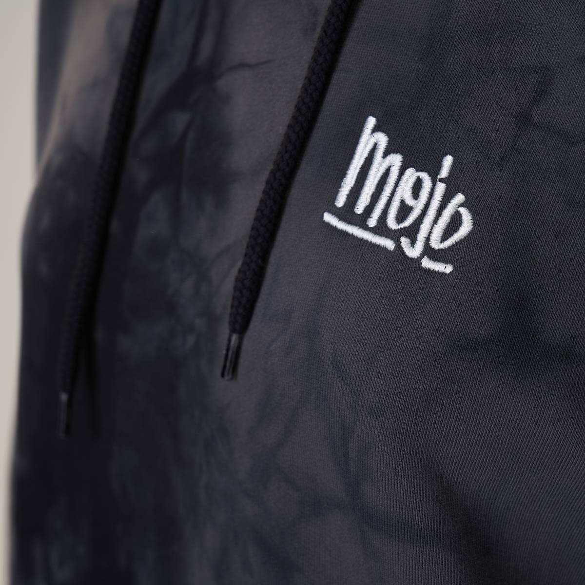 Mojo Summer Hoodie – Dieser stylische Acid-Washed Hoodie kombiniert die Colors Vintage black & black. Zudem gibt es den kleinen Mojo Type gestickt in weiss – Special: Jedes Piece ist individuell!