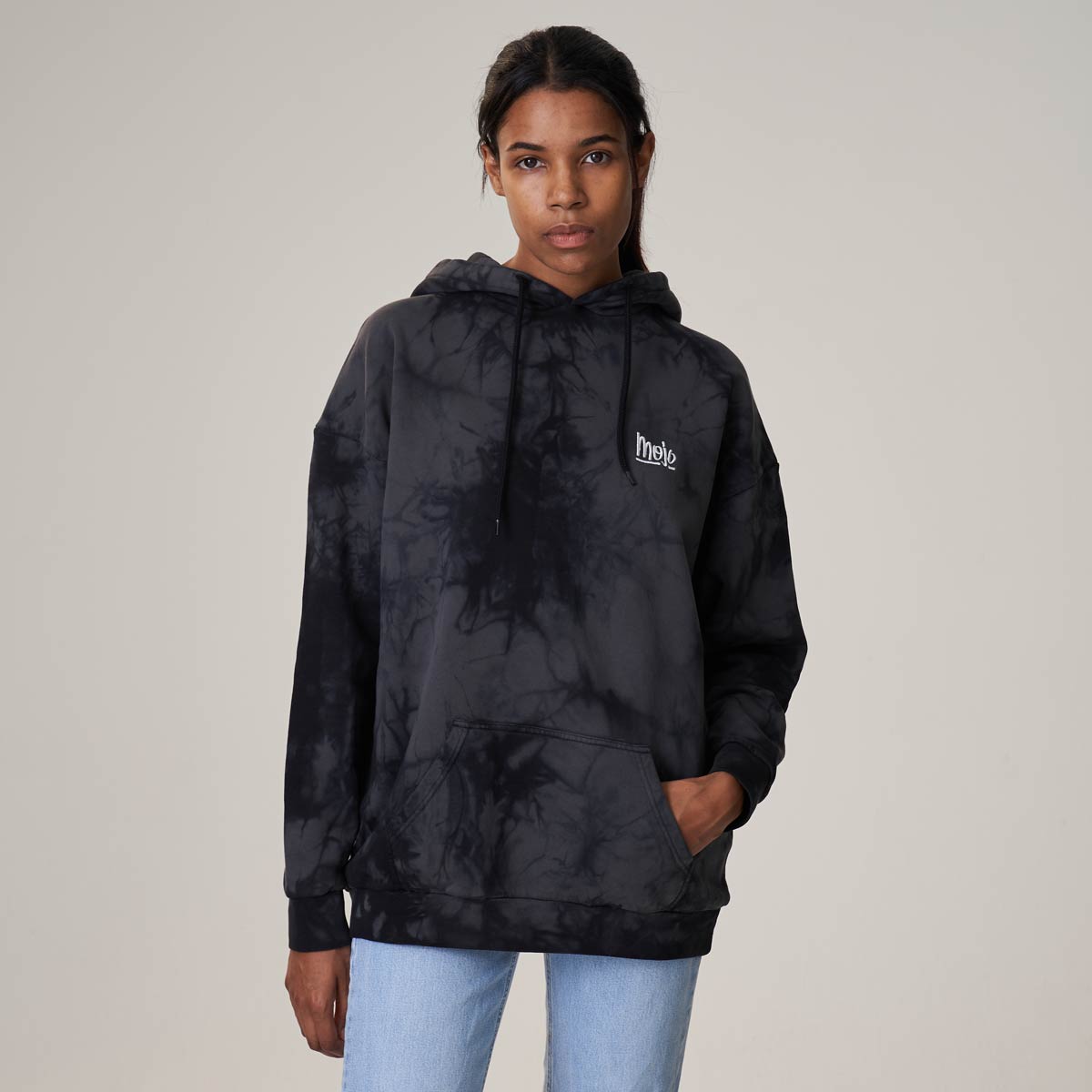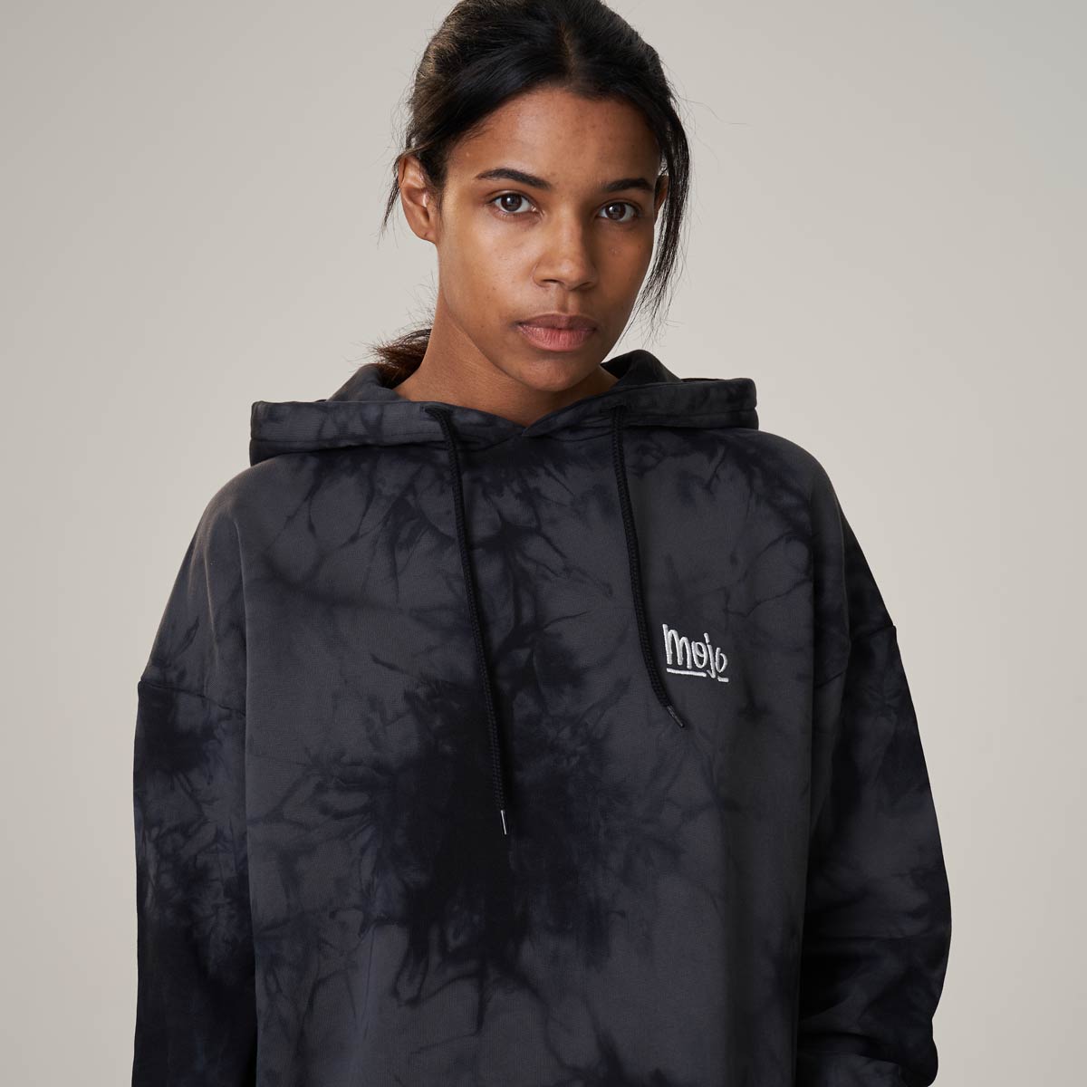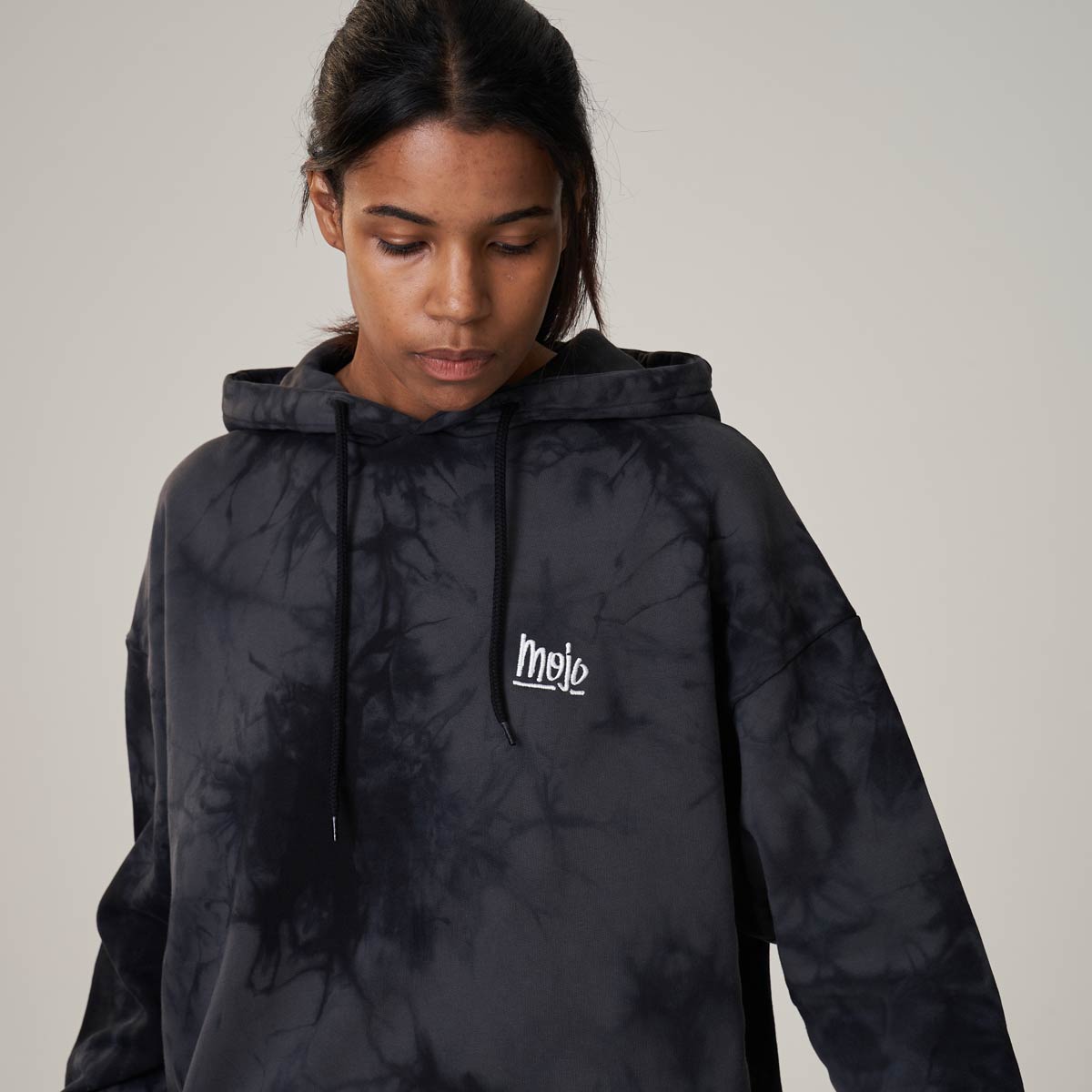 Mojo Summer Hoodie – Dieser stylische Acid-Washed Hoodie kombiniert die Colors Vintage black & black. Zudem gibt es den kleinen Mojo Type gestickt in weiss – Special: Jedes Piece ist individuell!