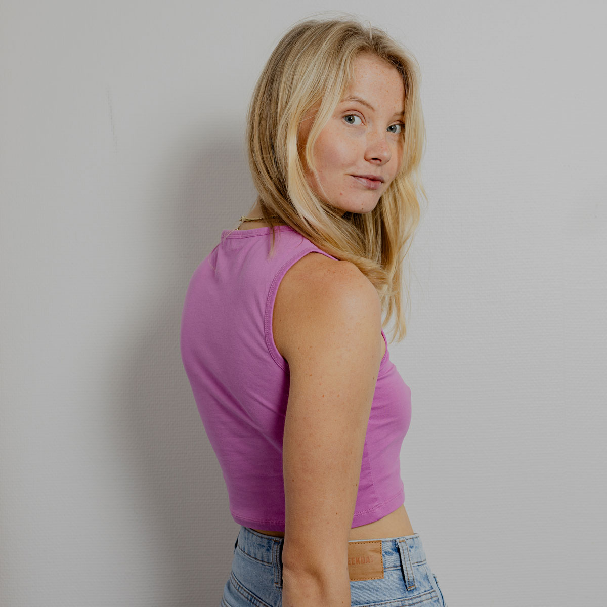Das neue Crop Shirt Rimini kommt in pink mit kleinem Mojo Stick auf der Front.