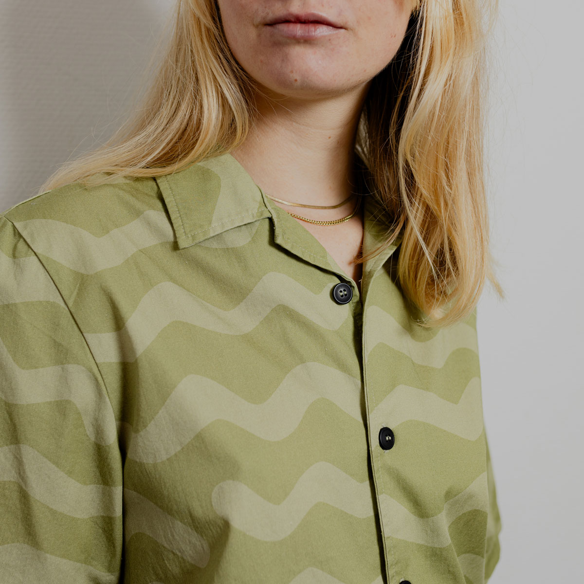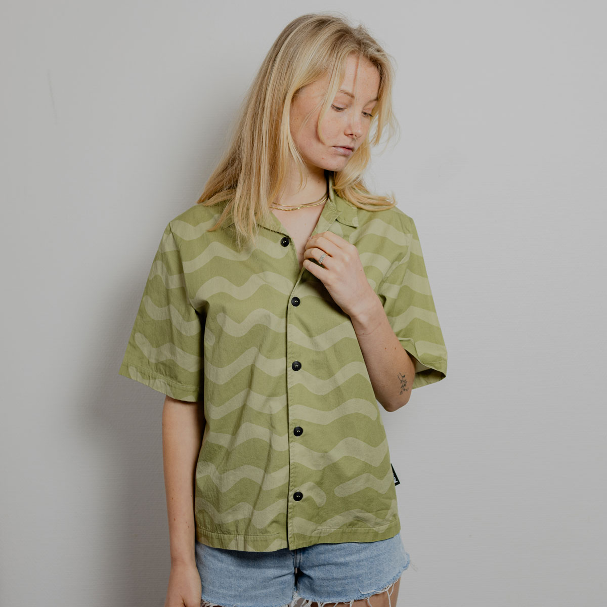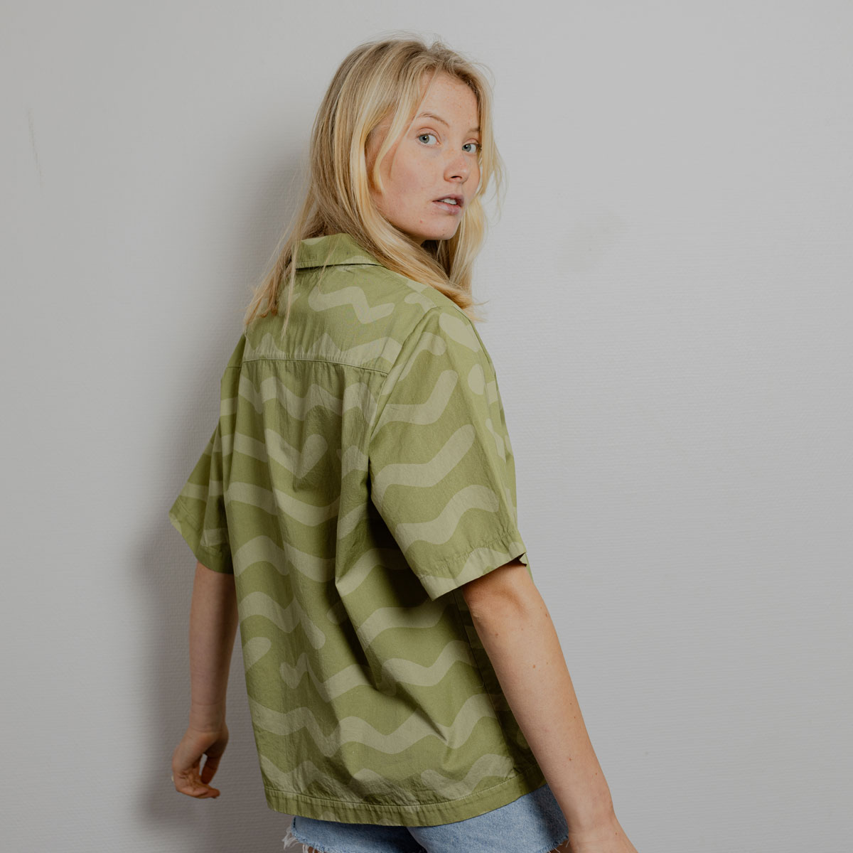 Happy Holiday – Das freshe Resort Shirt mit Reversekragen kommt in grün mit fettem Riviera Alloverpattern und schwarzen Knöpfen. Für einen lockeren Tragekomfort ist diesen Kurzarmhemd aus 100% organic Cotton.