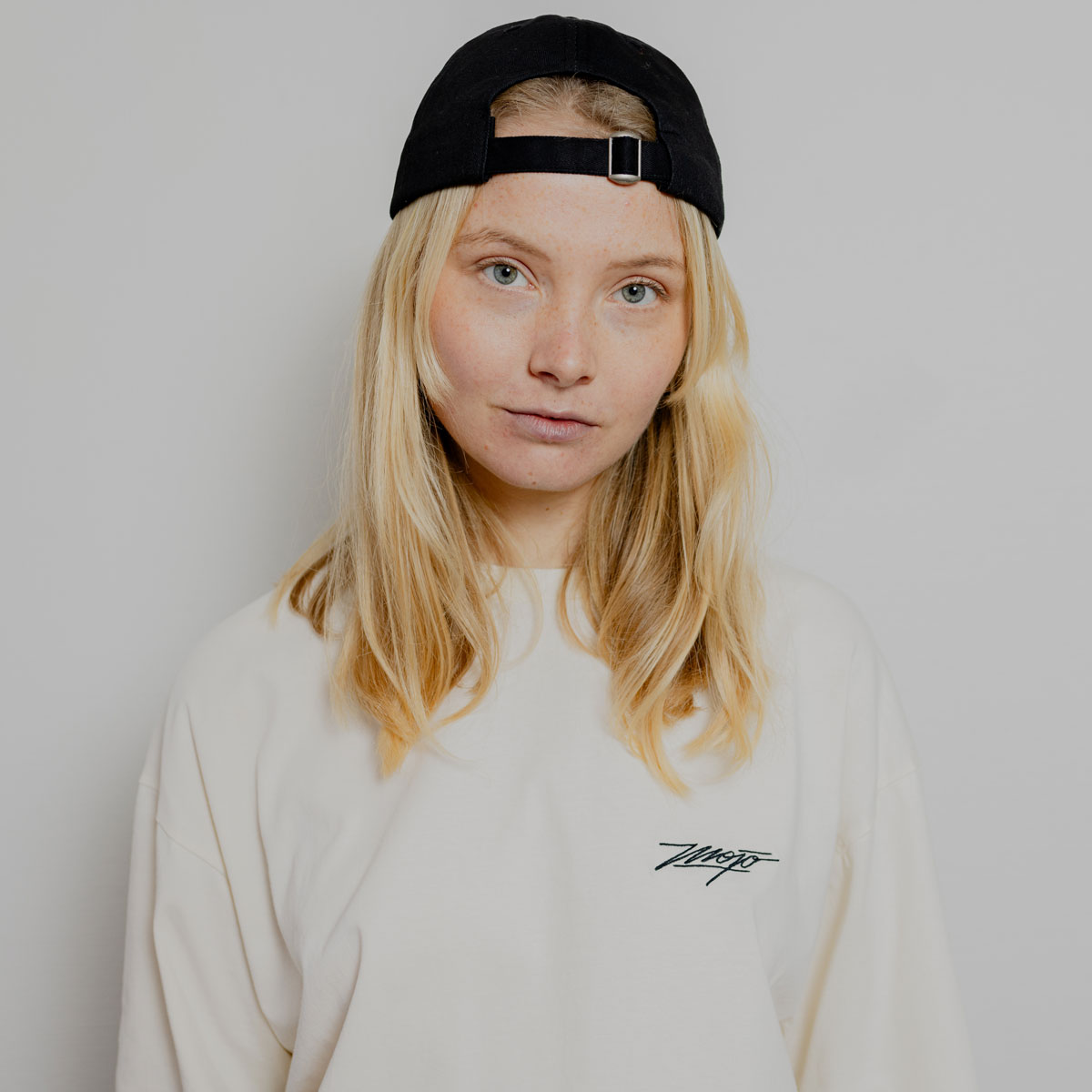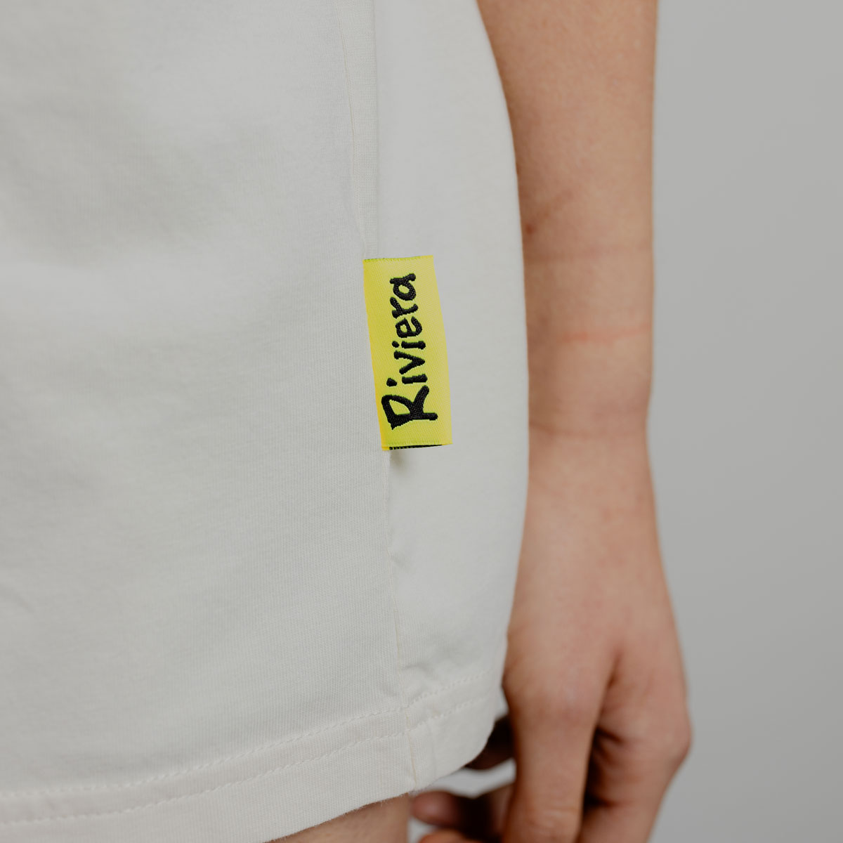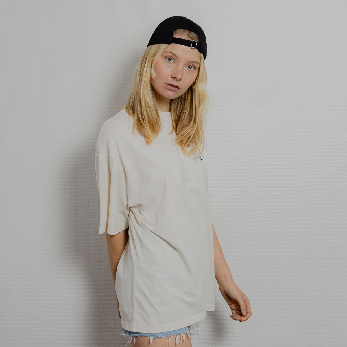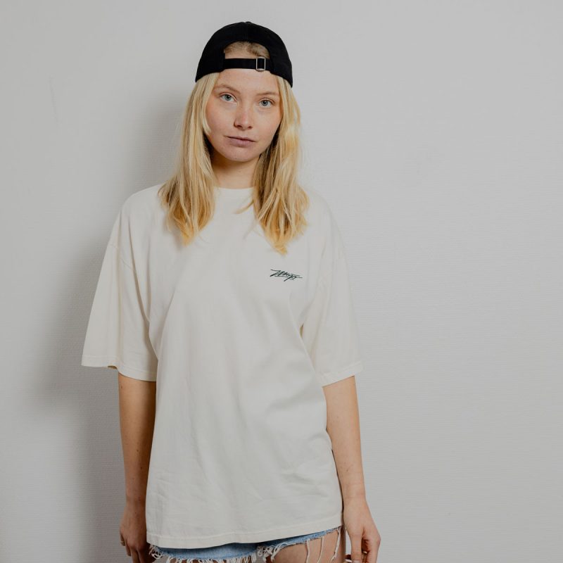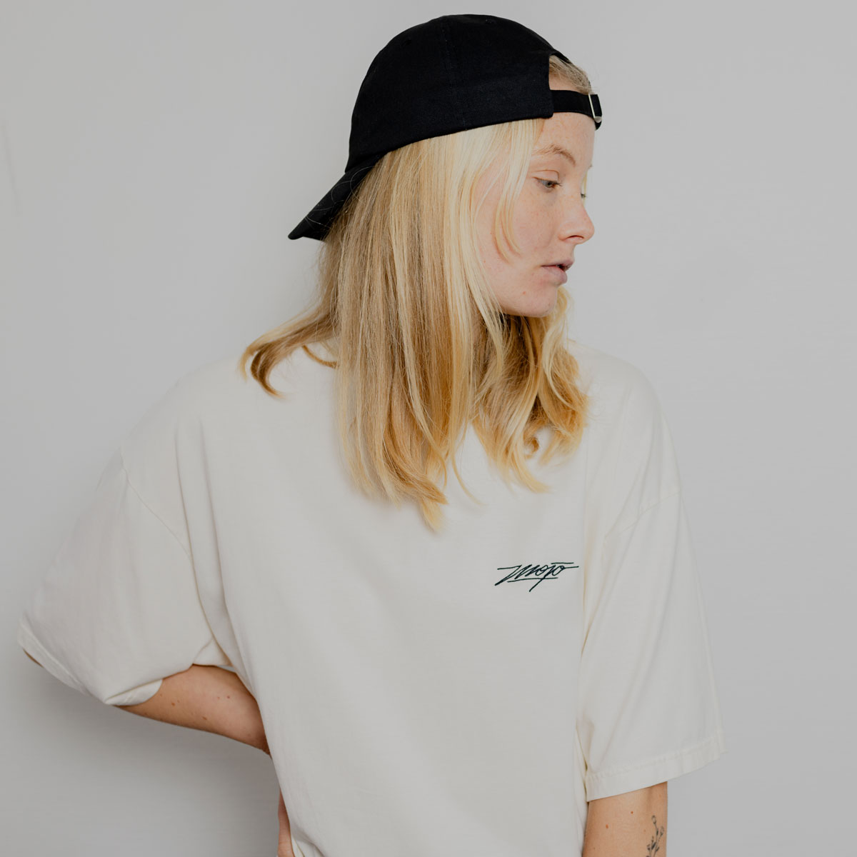 Ein Shirt wie das perfekte Urlaubsfoto – Das Oversized Shirt Cinque Terre kommt in feinstem Off-White mit kleinem Mojo Stick auf der Front und malerischem Sunset-Backprint (Vintage Look).