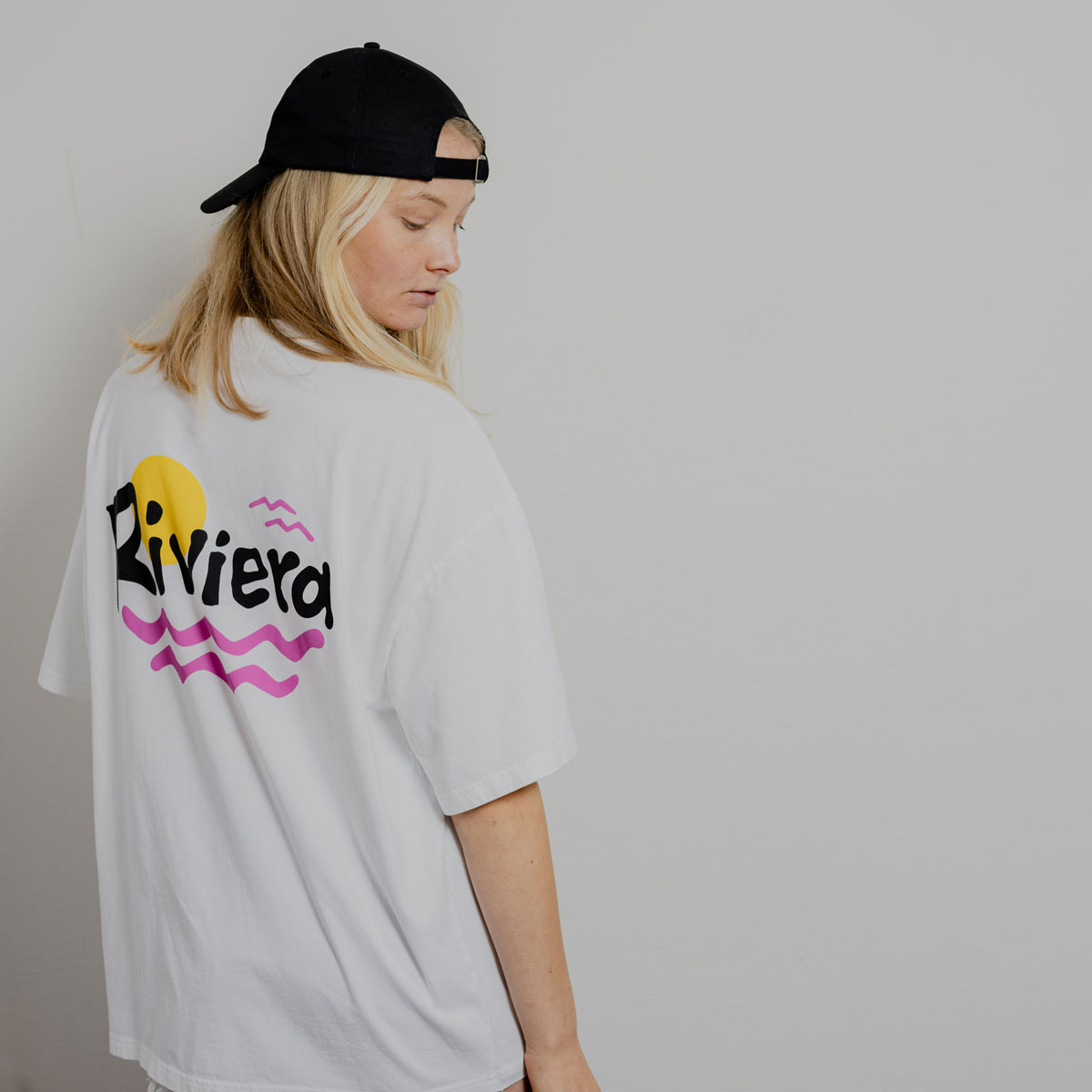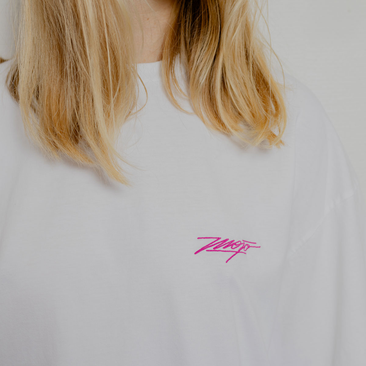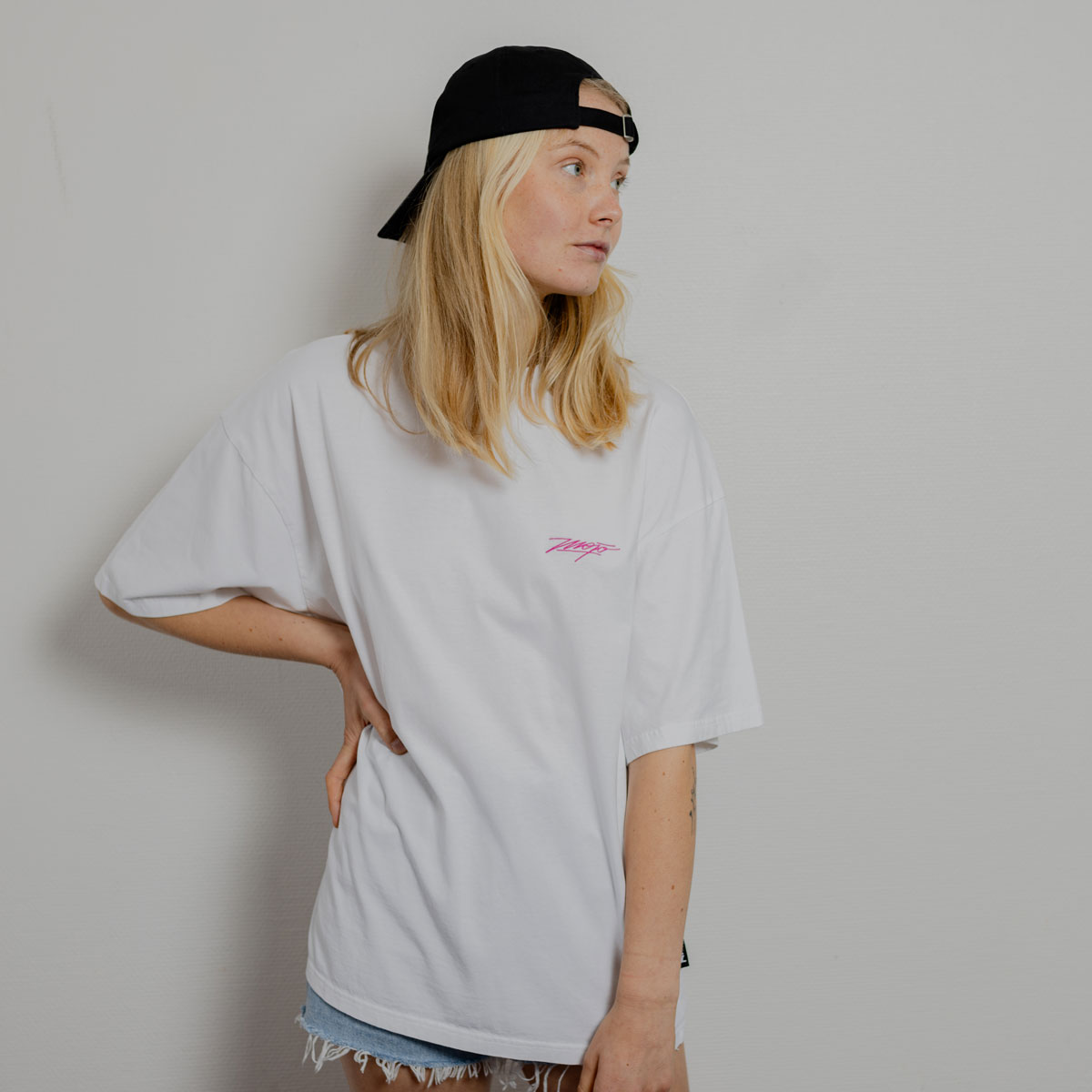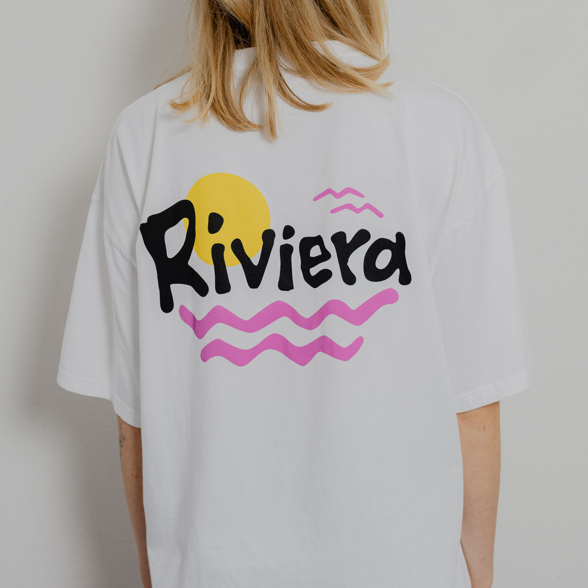 Happy Holiday – Das Oversized Shirt San Remo kommt classy in weiss mit kleinem Mojo Stick in pink auf der Front und feinstem Riviera Backprint (Vintage Look).