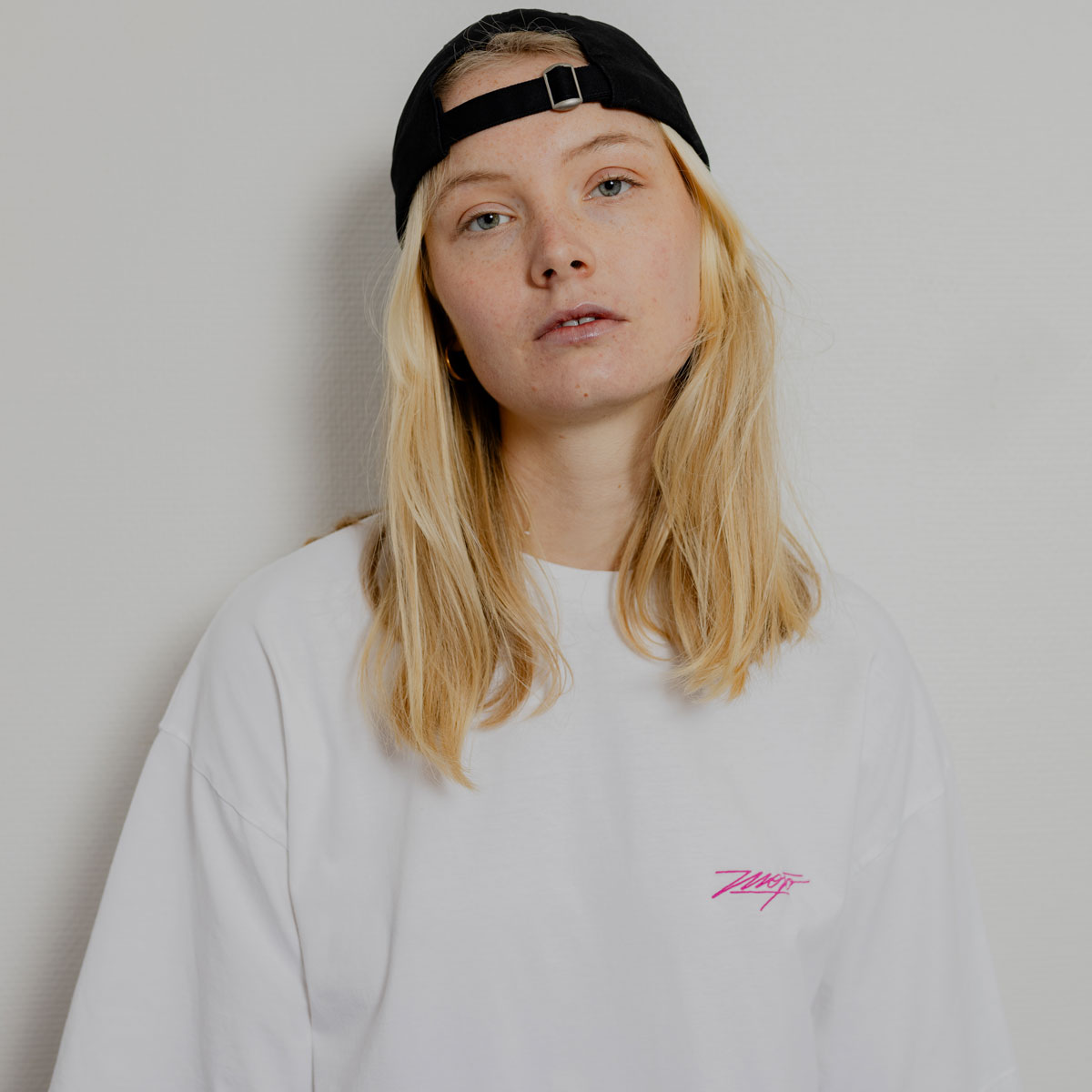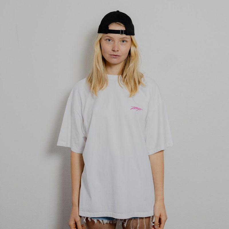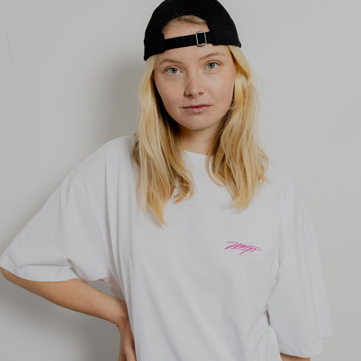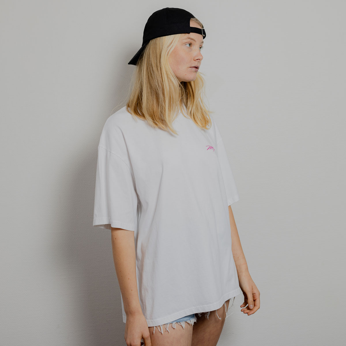 Happy Holiday – Das Oversized Shirt San Remo kommt classy in weiss mit kleinem Mojo Stick in pink auf der Front und feinstem Riviera Backprint (Vintage Look).
